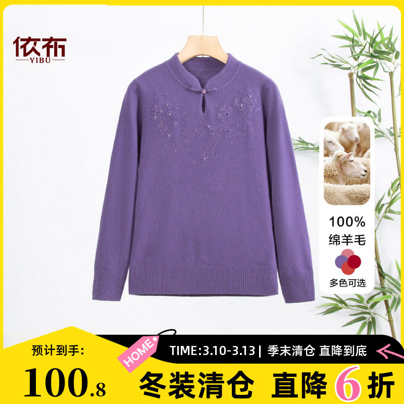依佈中老年妈妈装100%绵羊毛针织衫气质新中式羊毛衫大码打底上衣