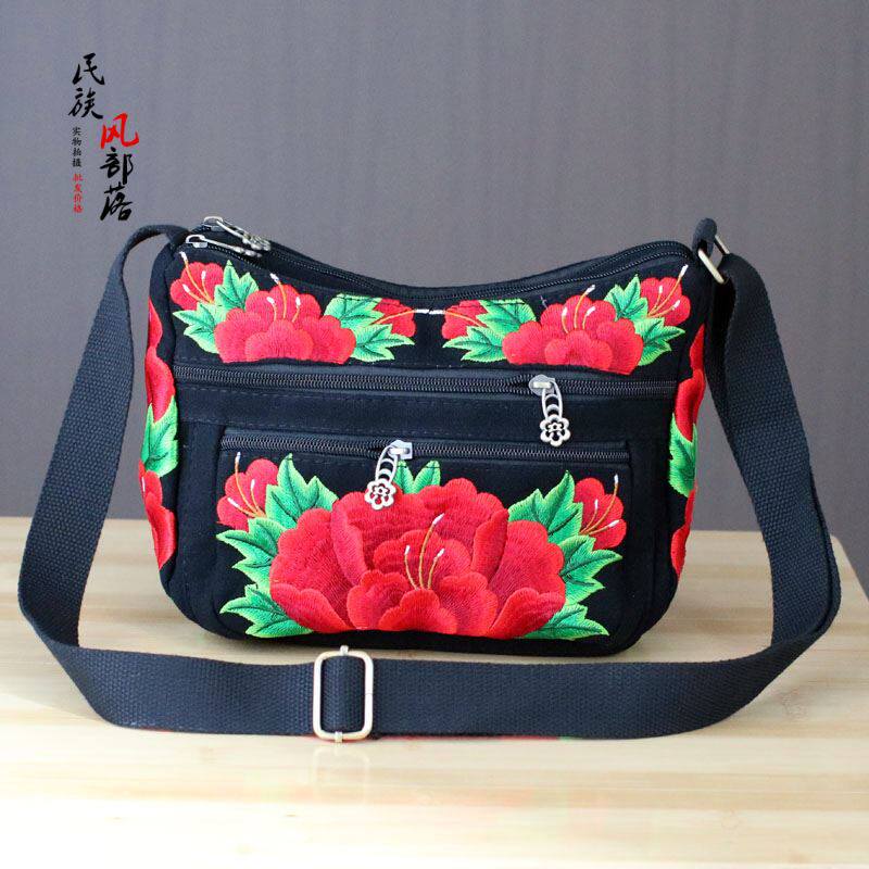 2023新款包民族风绣花包包帆布斜跨包孔雀刺绣女包中年单肩手提包