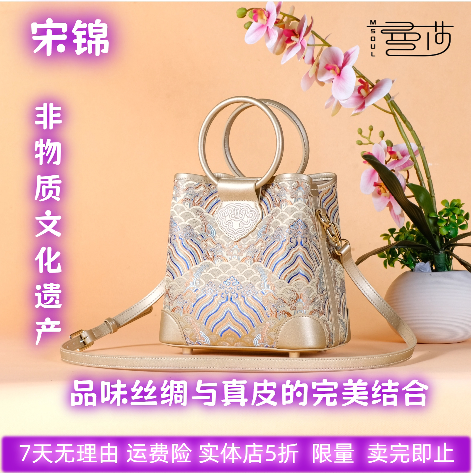 曼莎国风宋锦香云纱手提斜挎刺绣真丝牛皮新款新中式女包旗袍包包