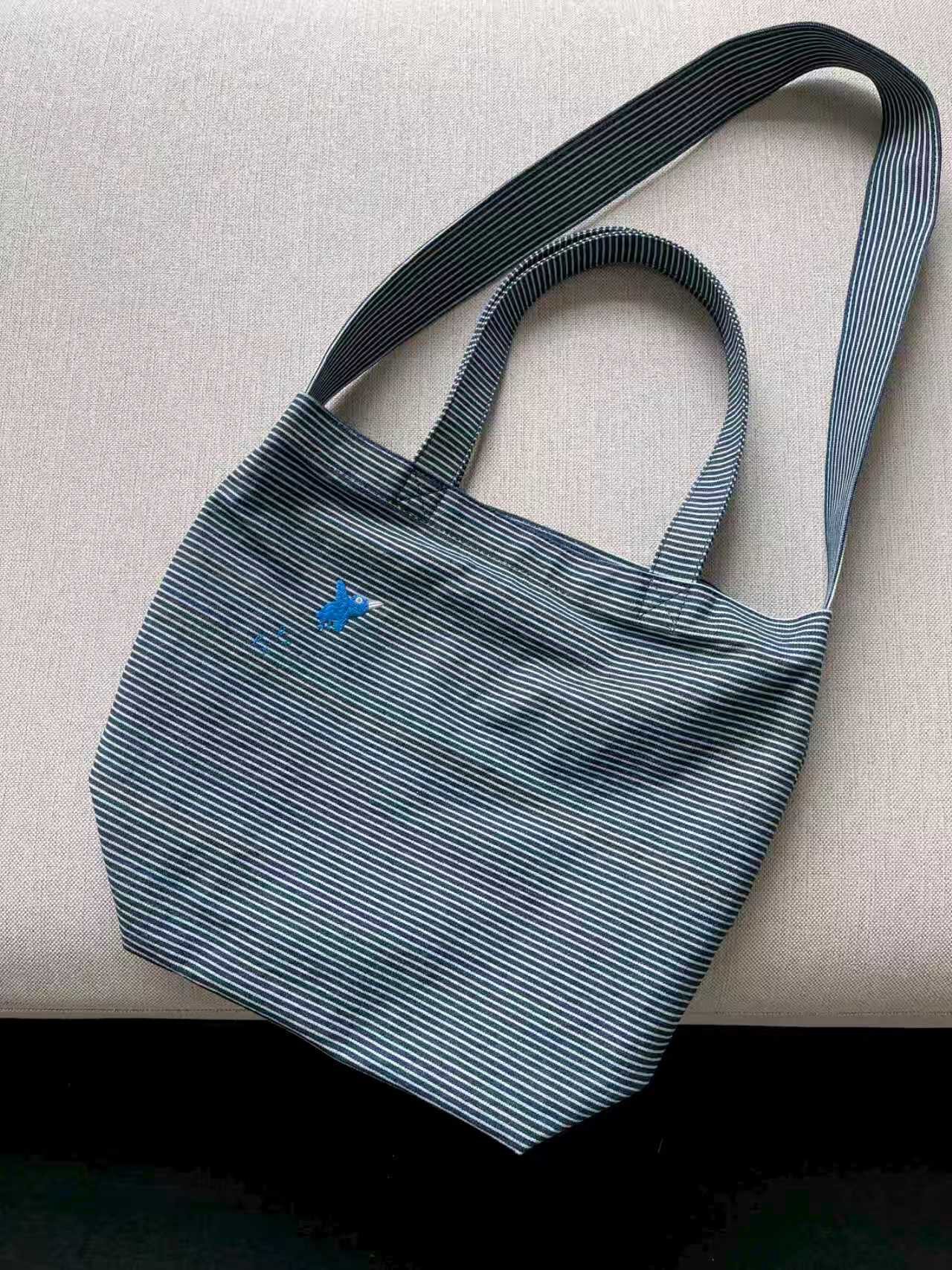 南油小众26早春新款日系洗水棉条纹刺绣女包便携大容量托特手提包