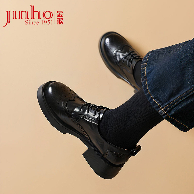 金猴女皮鞋厚底2026年春季新款中跟系带皮鞋女雕花休闲布洛克女鞋