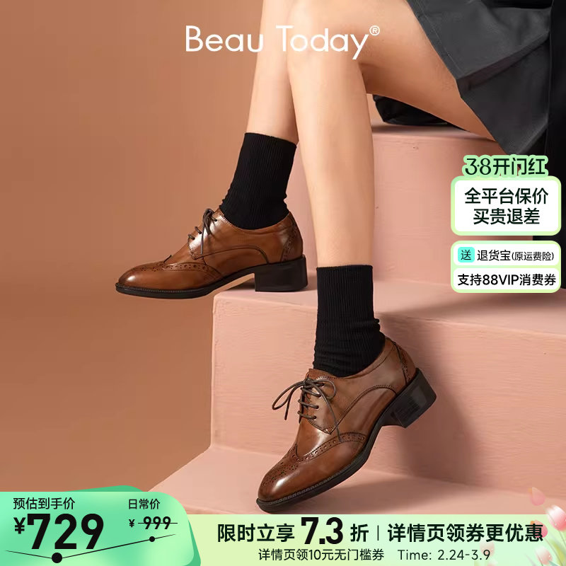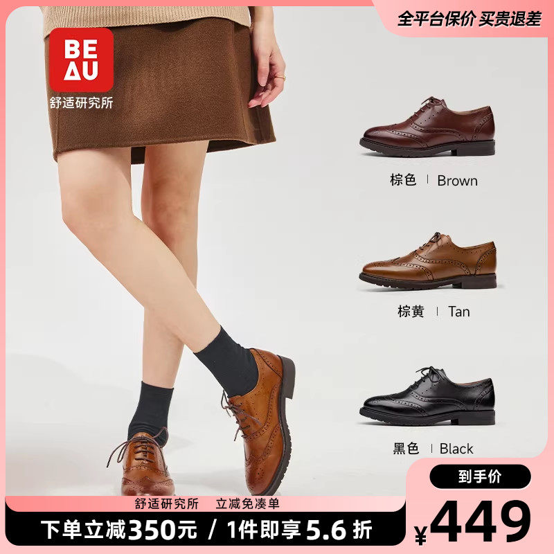 BeauToday英伦风小皮鞋女春季复古牛津鞋真皮布洛克女鞋厚底单鞋
