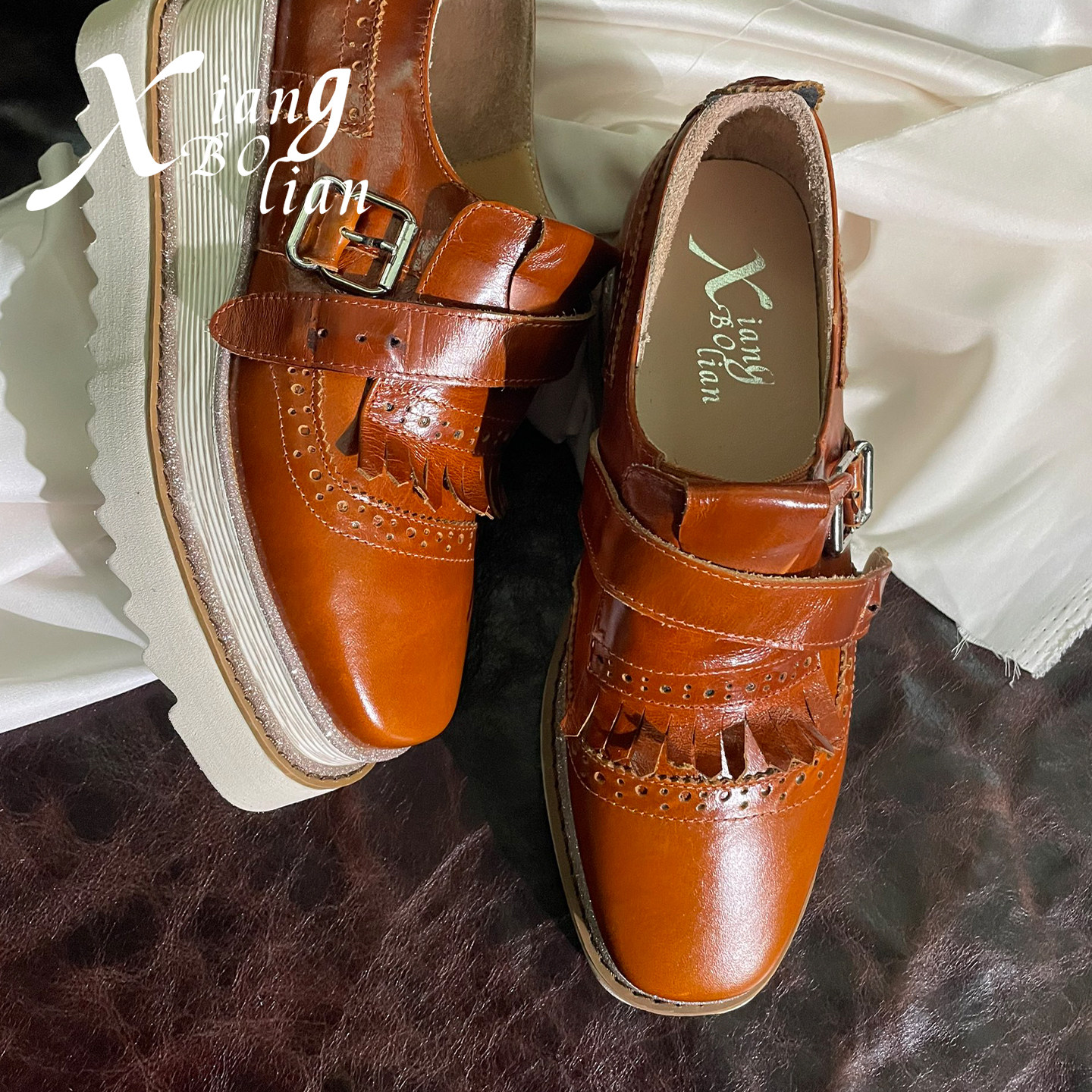 YANGDASHU 手工鞋油蜡牛皮坡跟厚底松糕单鞋纯手工流苏布洛克女鞋