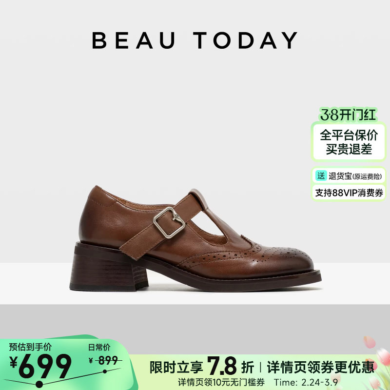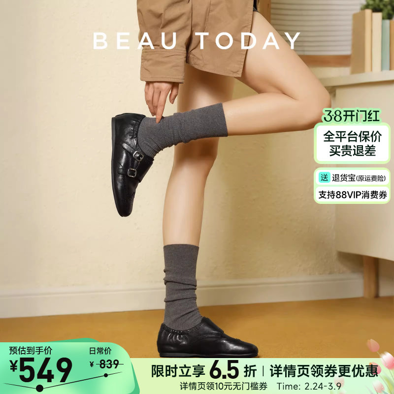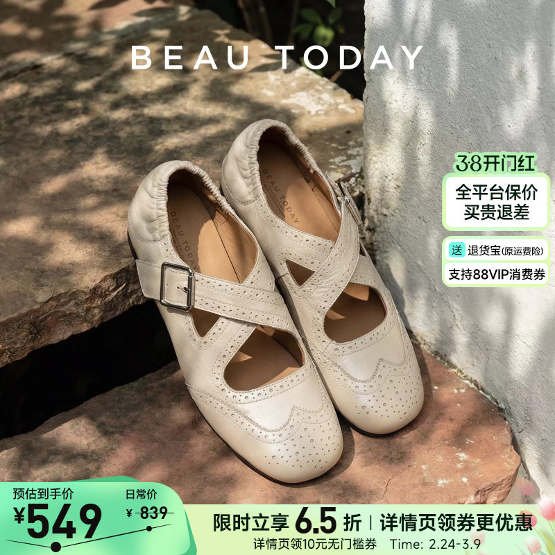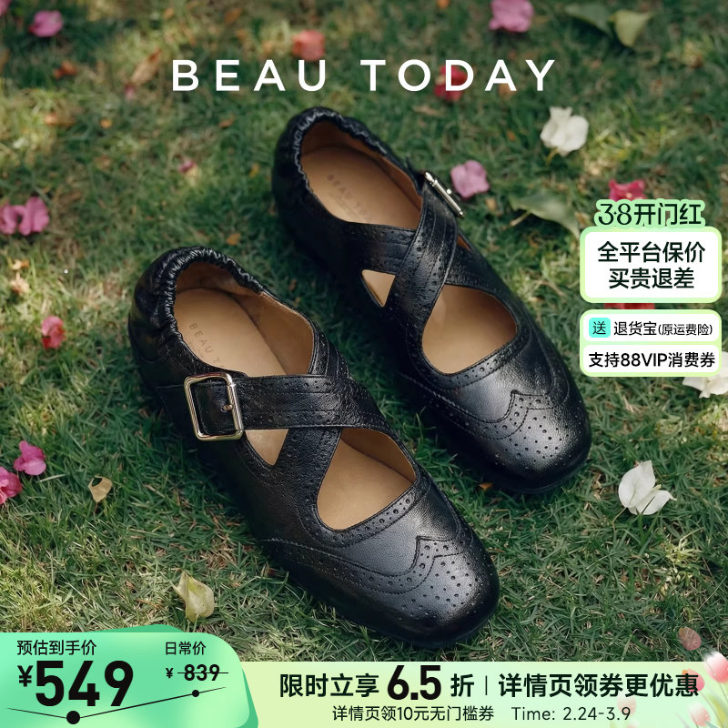 BeauToday平底玛丽珍鞋女2026新款春季羊皮浅口单鞋BT布洛克女鞋