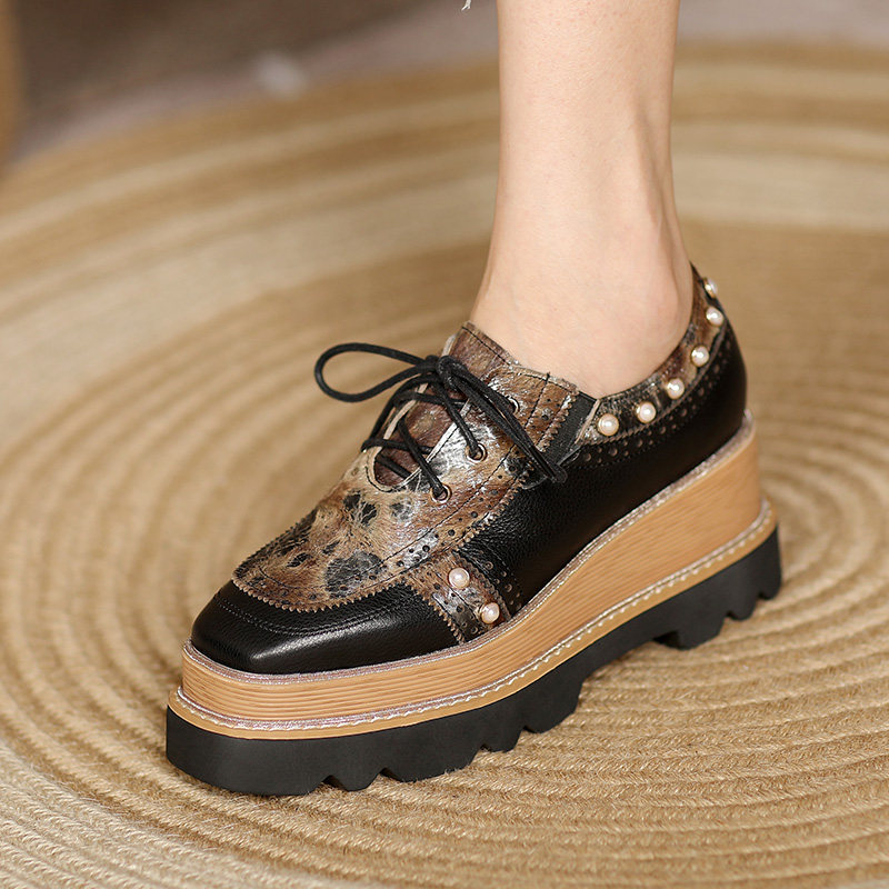 杨小东真皮系带坡跟厚底松糕鞋原创新款春时尚珍珠平底布洛克女鞋