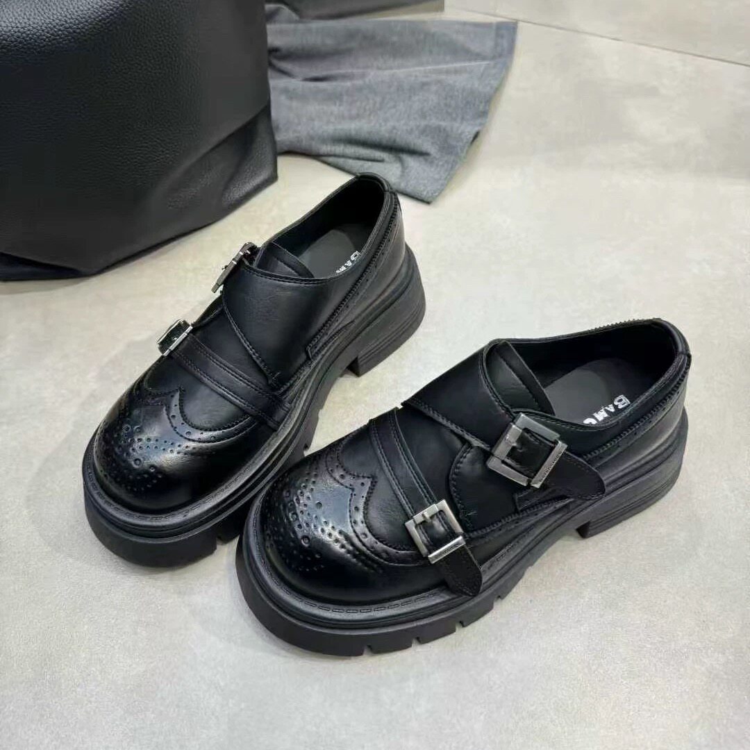 Rongshanyue牛皮布洛克女鞋双扣厚底英伦风乐福鞋小皮鞋女B1524