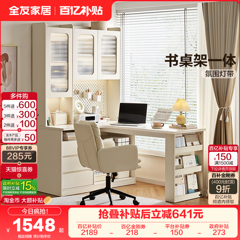 转角书桌书架一体组合实木轻奢风电脑桌家用台式办公桌学习桌书柜
