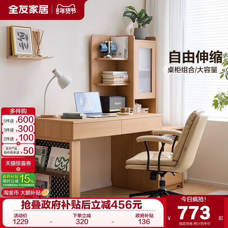 全友家居原木风伸缩组合书桌书柜一体卧室书房电脑桌办公学习桌子