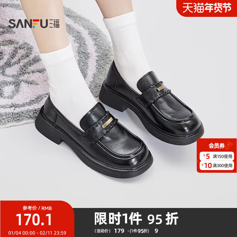 三福女乐福鞋冬季静奢老钱穿花绳简约纯色圆头休闲女鞋848898
