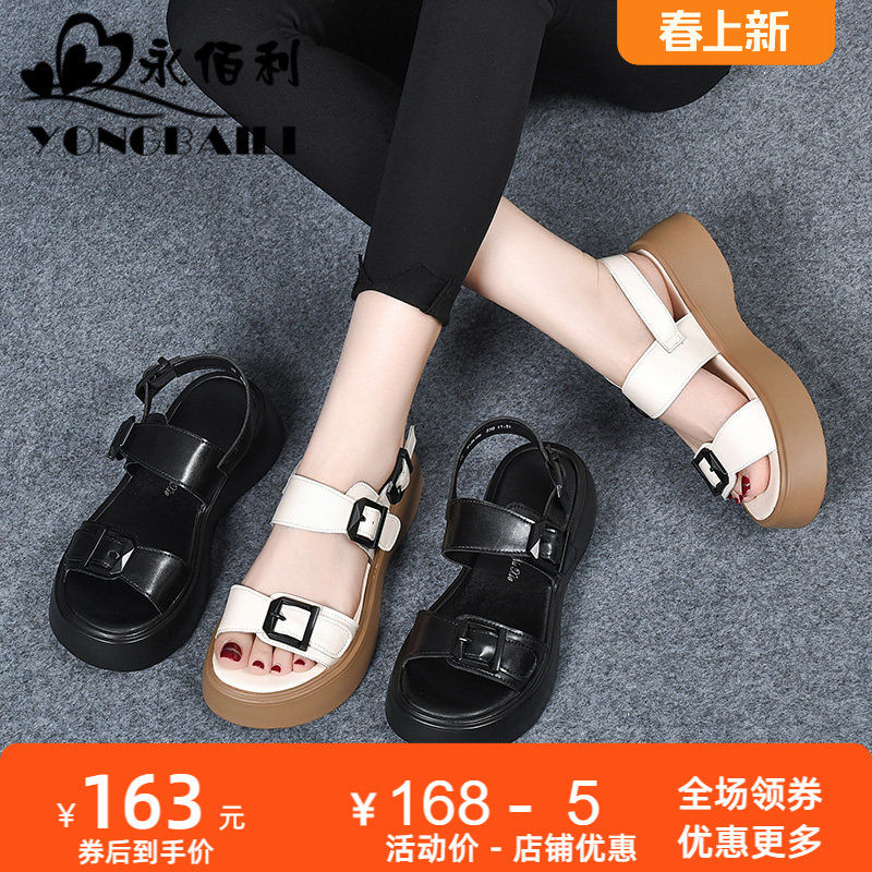罗马厚底真皮凉鞋女2025年夏季新款圆头松糕鞋时尚皮带扣休闲女鞋