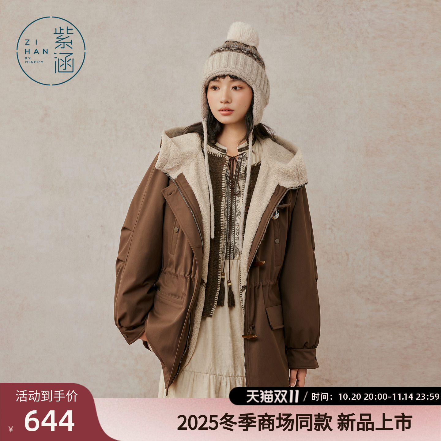 紫涵连帽收腰棉服外套女2025年冬季新款内里羊羔毛保暖牛角扣棉衣