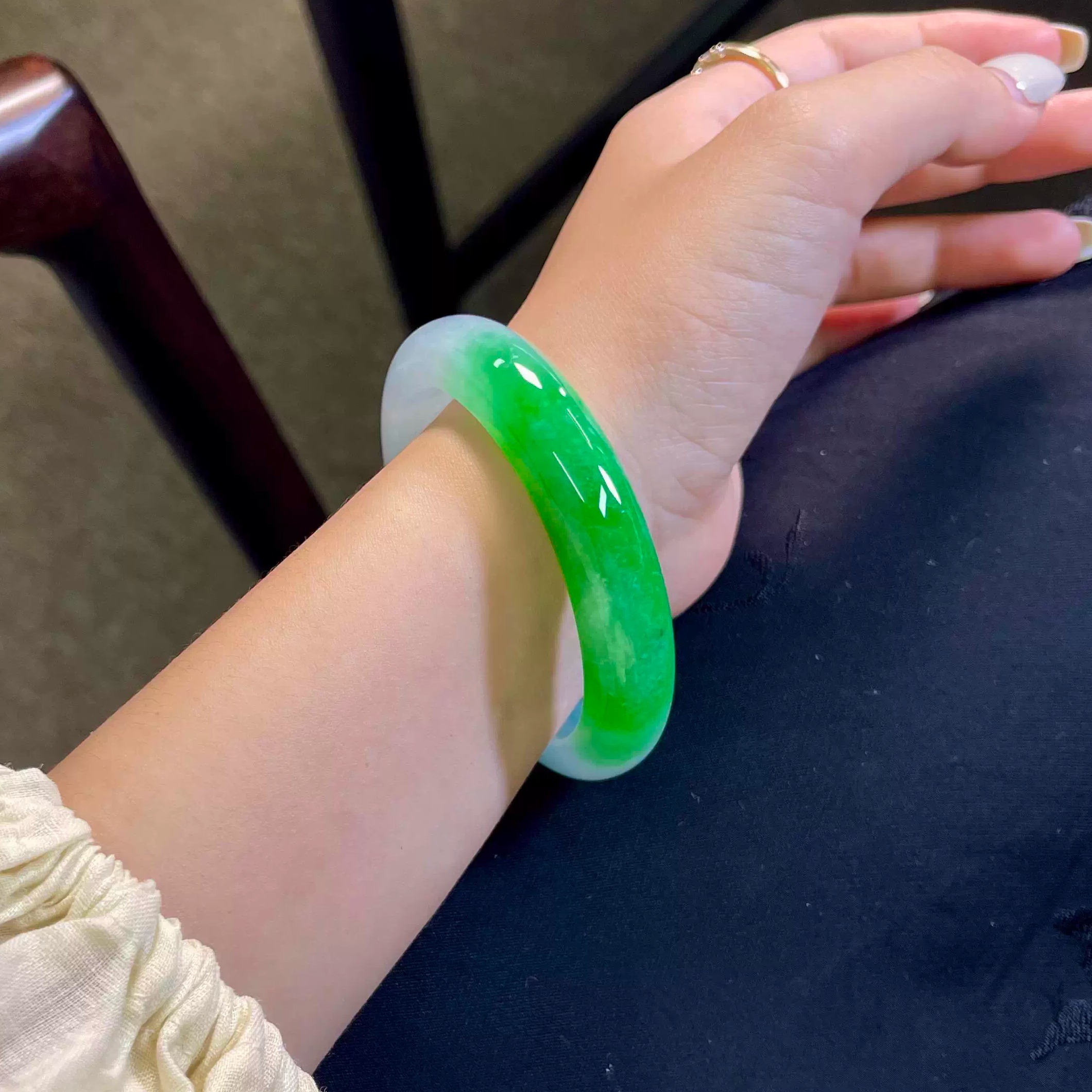 最相物"飘然系列"缅甸高端翡翠高冰种阳绿飘花玉手镯子真玉石处理