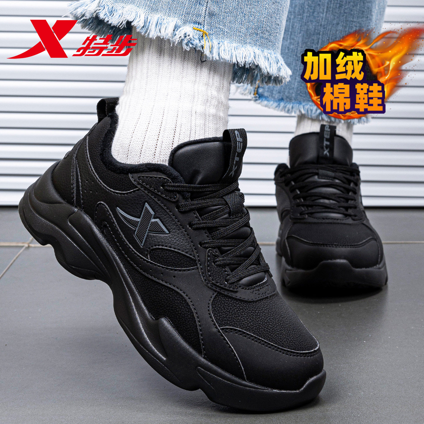 特步冬季加绒女鞋运动鞋女2026新款加厚保暖棉鞋黑色休闲防水板鞋
