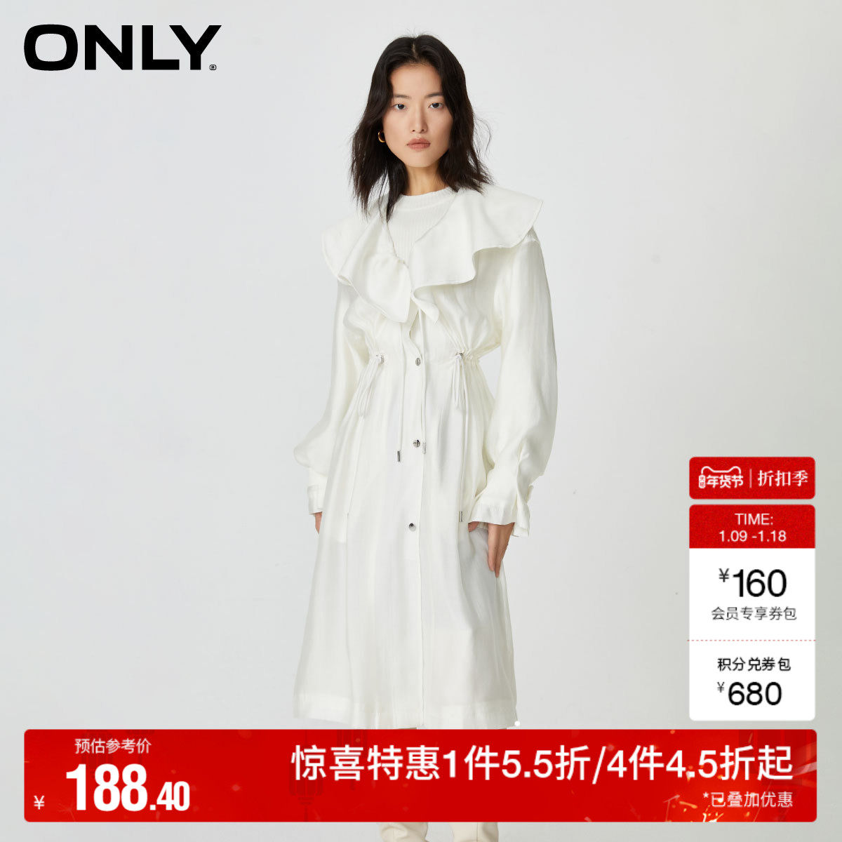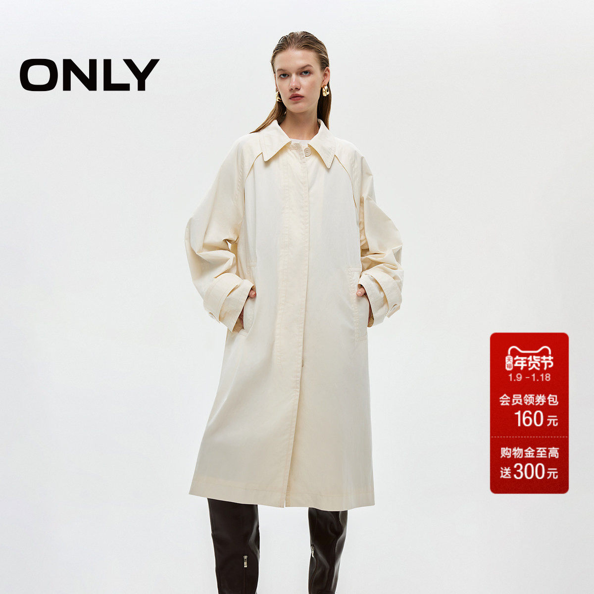 ONLY2025冬季新款纯色翻领双层隐形门襟插肩宽松中长款风衣外套女