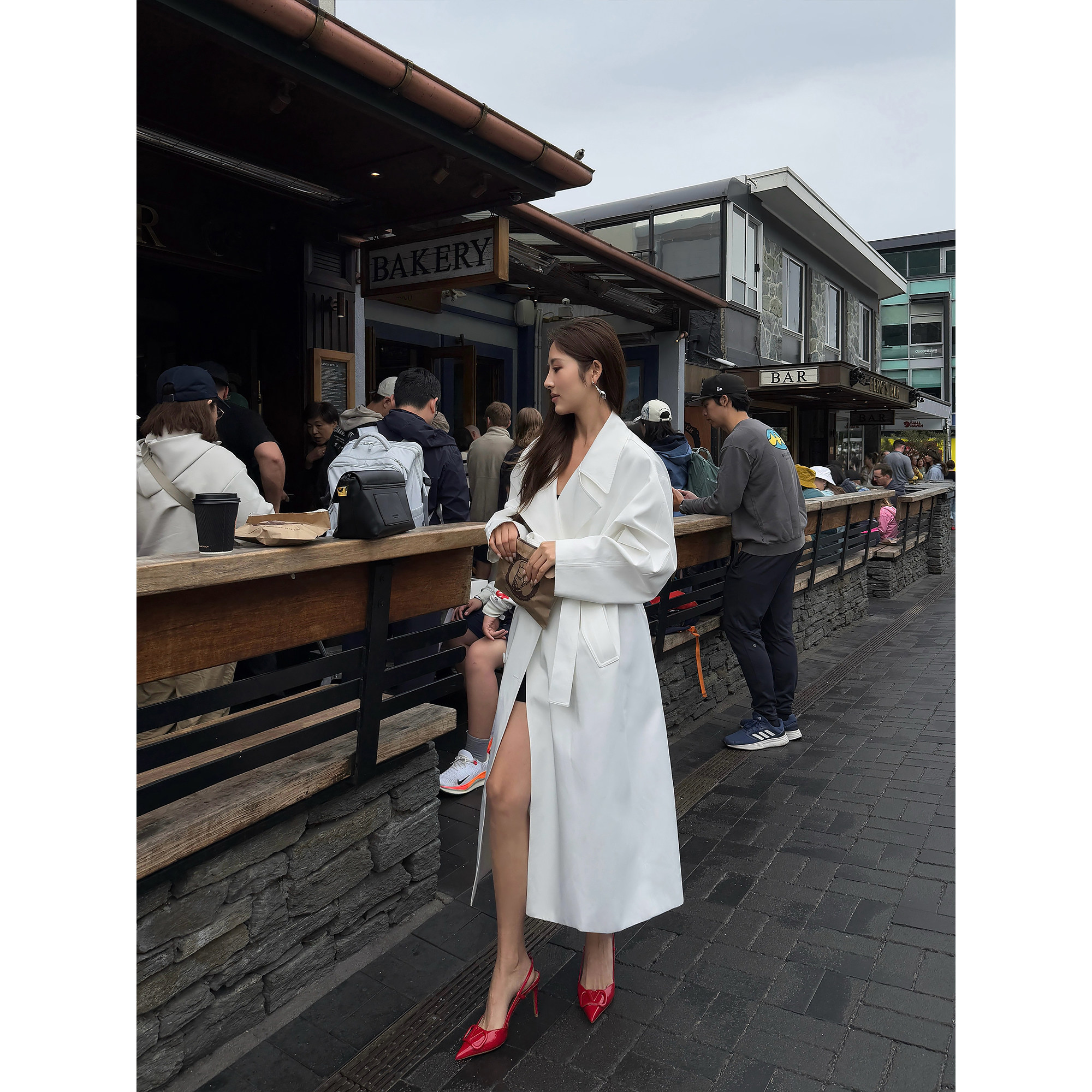 NEVA HU【现货6.5折】中长款风衣外套女2025翻领系带气质收腰大衣