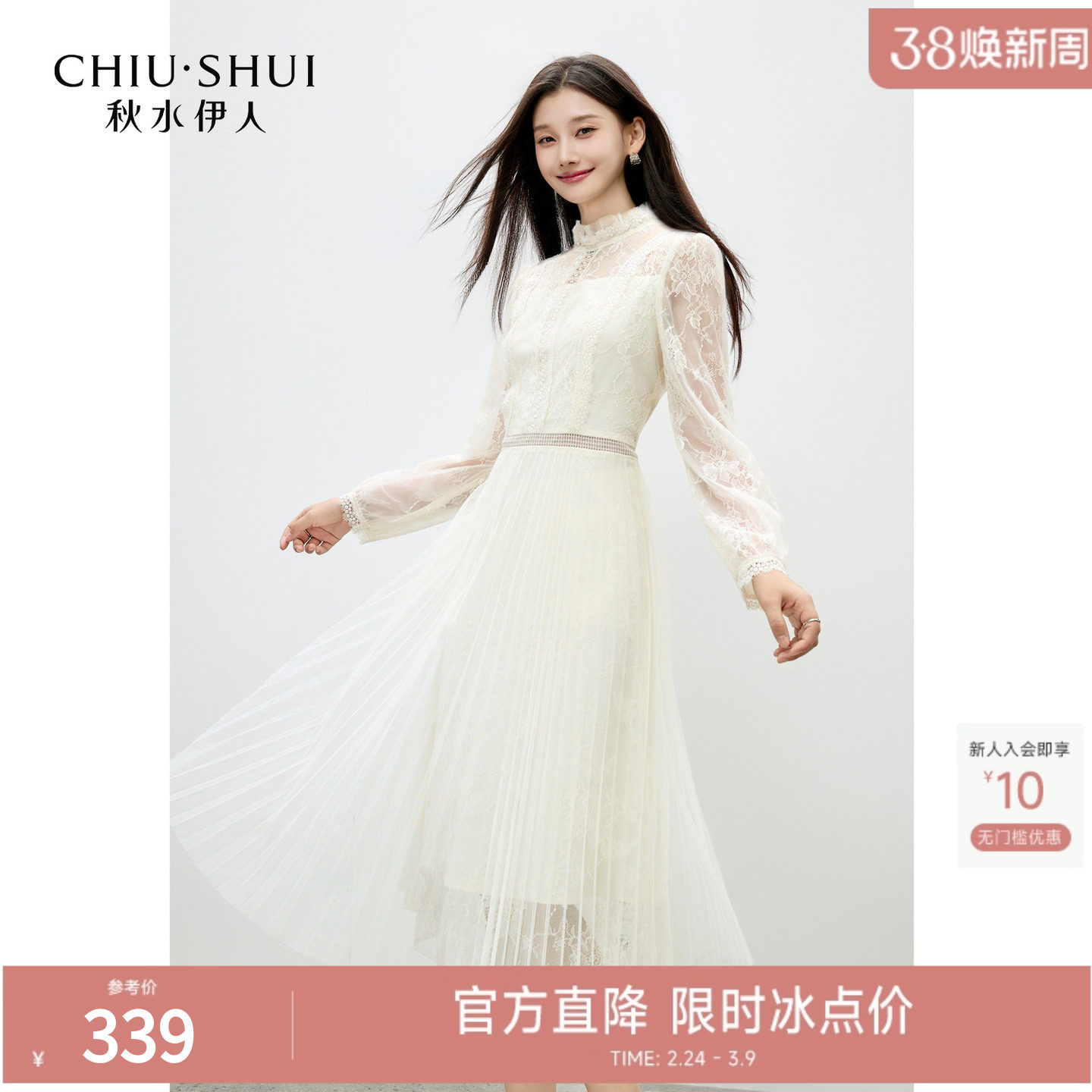 秋水伊人优雅百搭收腰连衣裙2026年春季新款蕾丝压褶假两件A字裙
