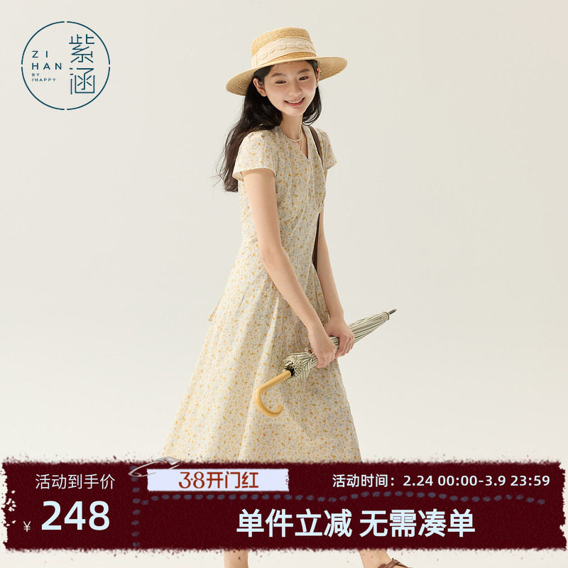 紫涵蕾丝边V领碎花连衣裙女夏季新款日系气质淑女短袖收腰a字长裙