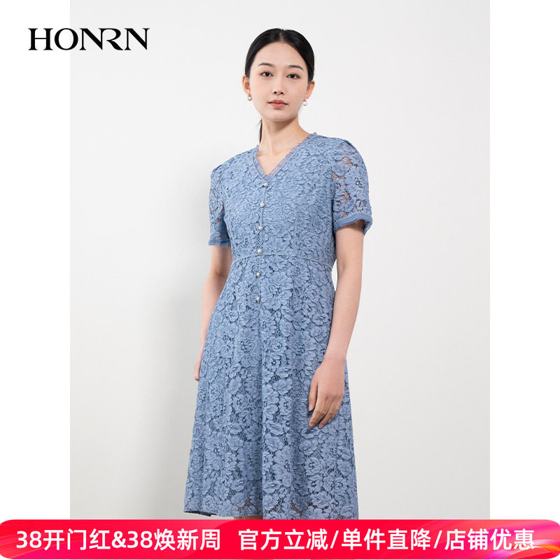 HONRN/红人气质蓝色v领修身收腰显瘦a字蕾丝连衣裙女夏HH22OL670