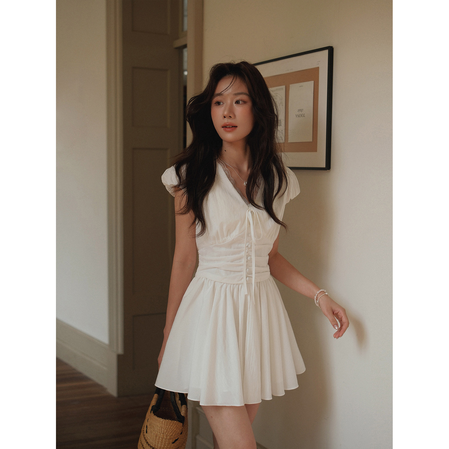 JOCO CHIC 法式蕾丝拼接v领系带短袖连衣裙女夏季捏褶收腰a字短裙