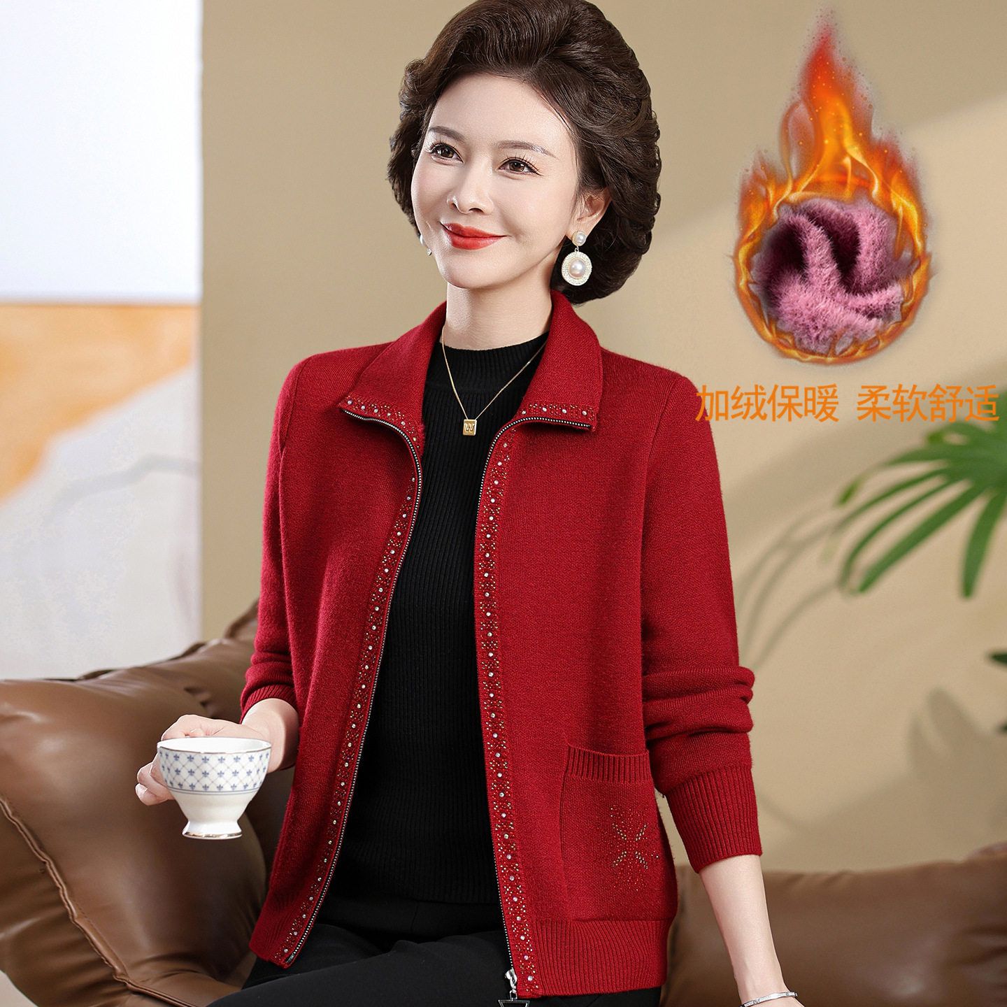 恒源祥妈妈装加厚毛衣外套秋冬新款开衫中老年人奶奶加绒保暖拉链