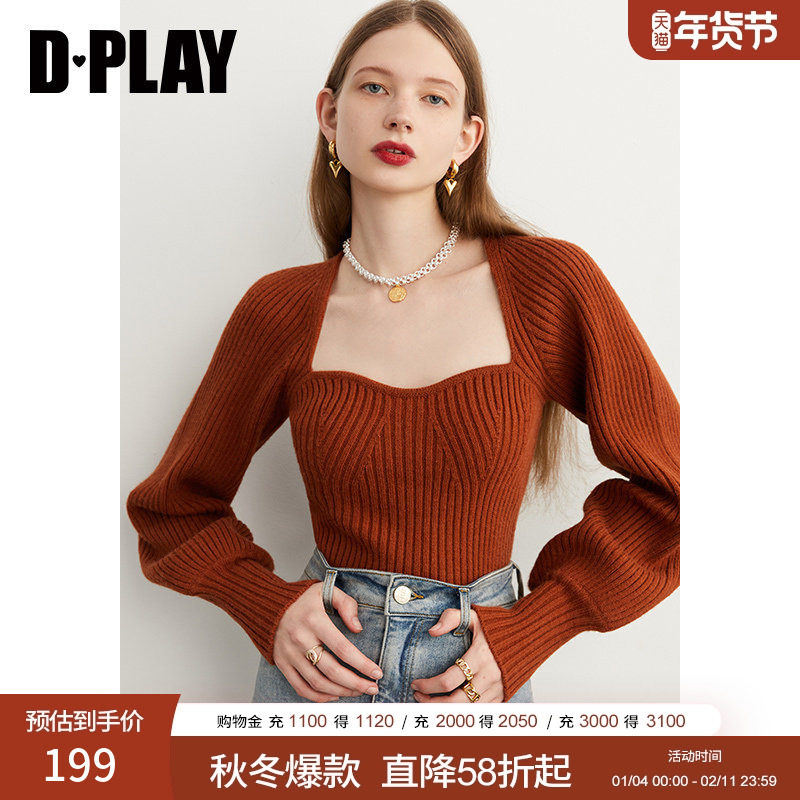 DPLAY2025秋季法式方领毛衣红色针织衫灯笼袖毛衣厚款上衣女