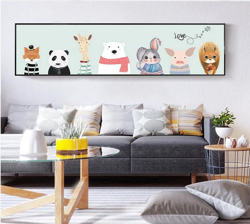 男孩卧室挂画床头北欧装饰画小熊长颈鹿可爱卡通小动物儿童房横幅