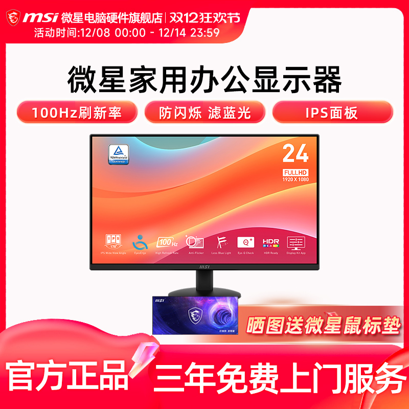 微星 24英寸显示器IPS 100Hz 防蓝光不闪屏 莱茵护眼认证 MP242L