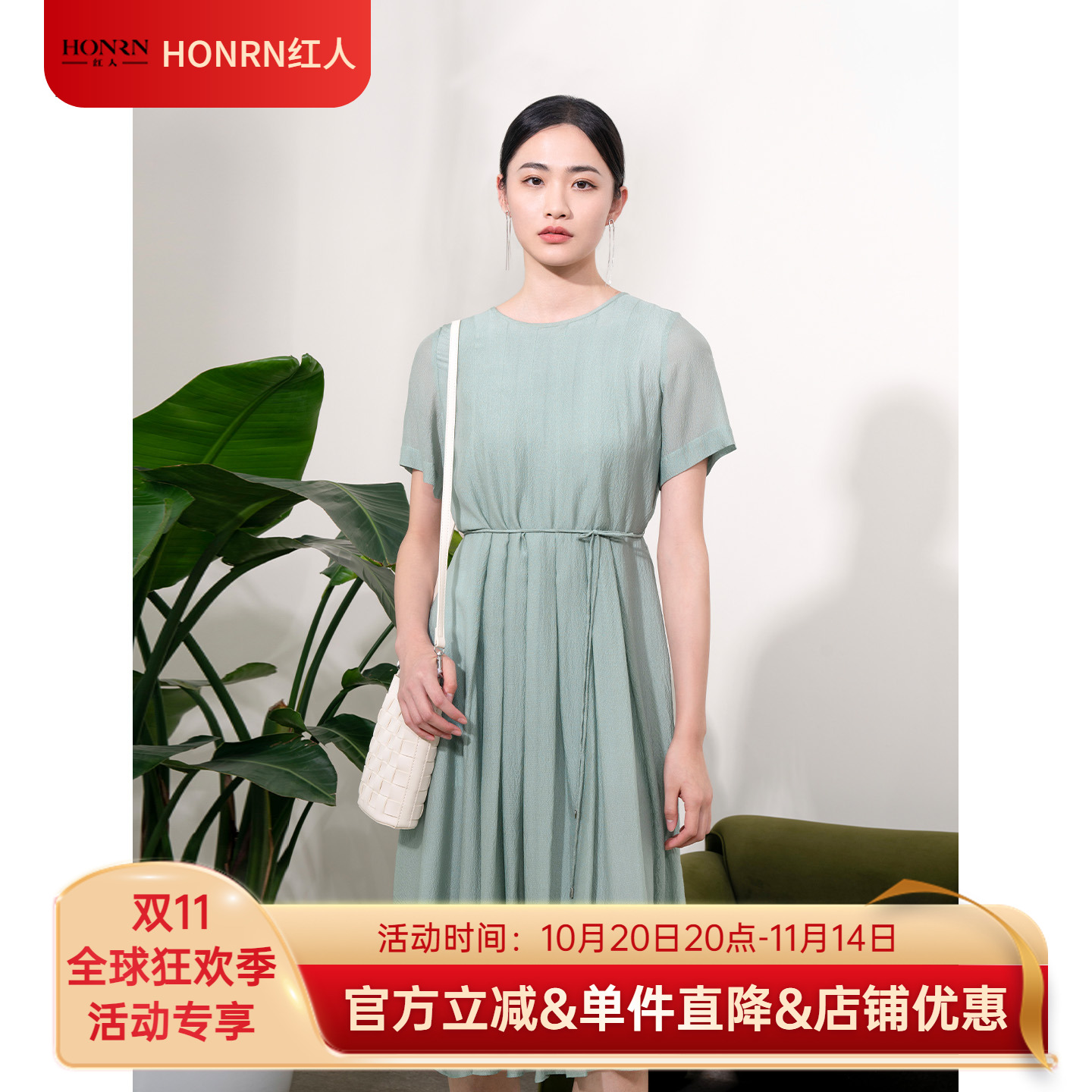 HONRN/红人桑蚕丝真丝系带收腰显瘦圆领a字连衣裙女夏HI22OL490