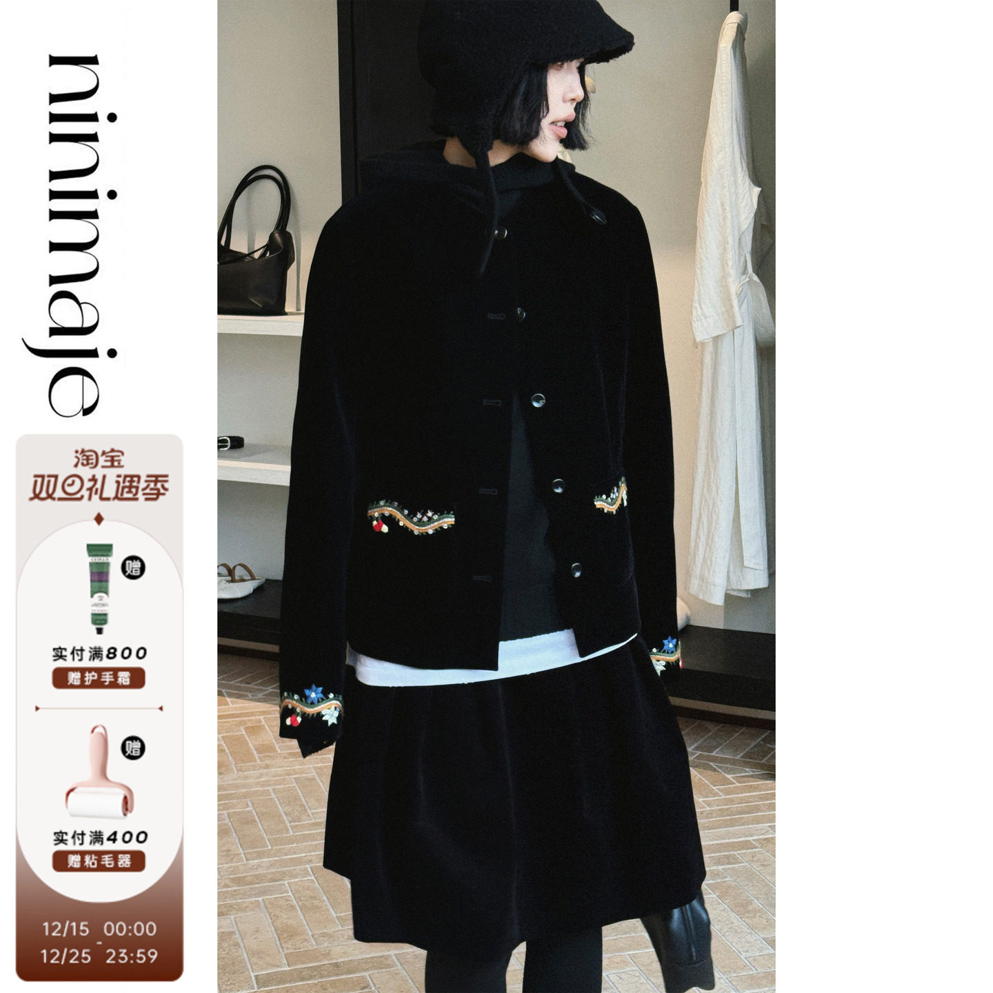 南北贝'手工刺绣丝绒外套'极简设计感国风外套女冬季高级感上衣