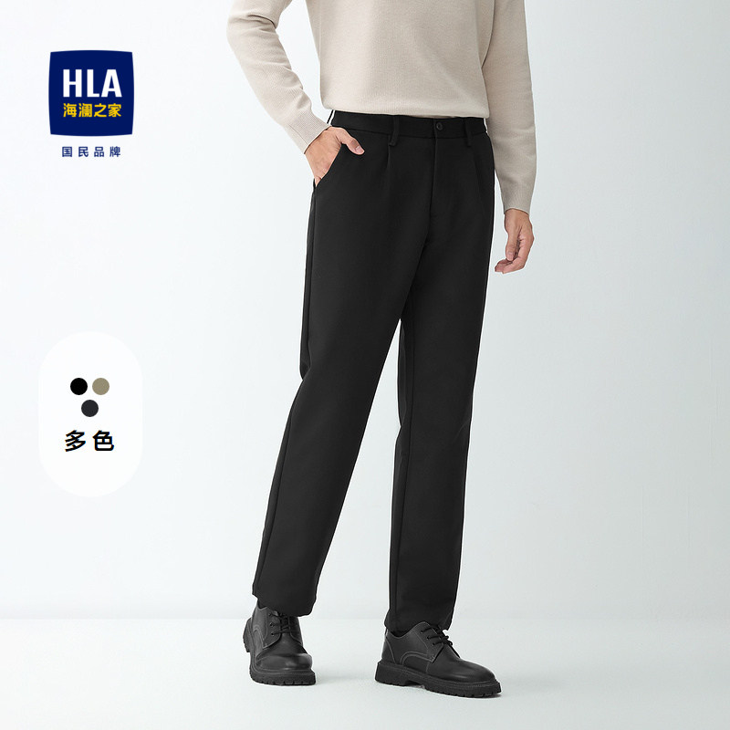 HLA/海澜之家轻商务加厚直筒裤秋冬季新款刺绣黑色休闲长裤子男士