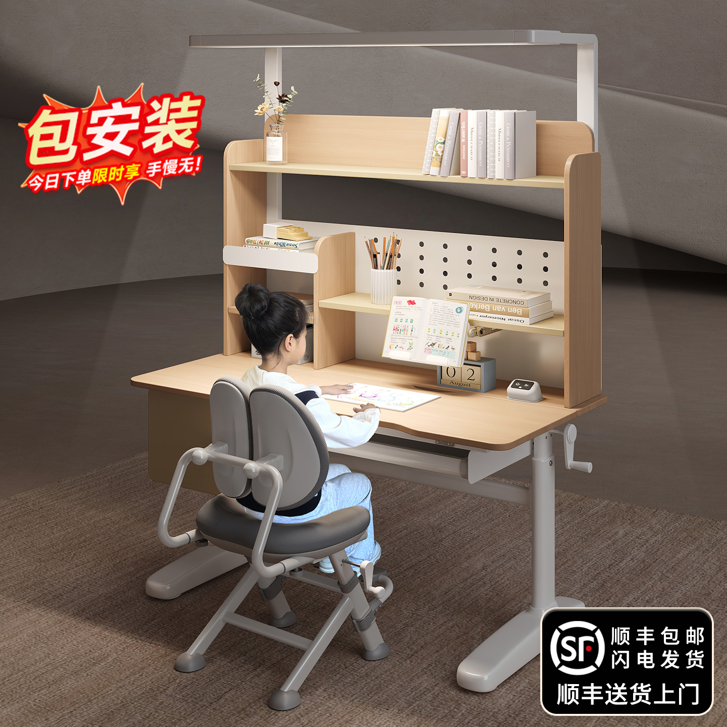 育才儿童学习桌书桌一体灯可升降小学生家用实木写字桌椅百宝书案