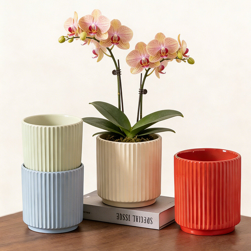 新款花盆陶瓷亚光竖纹北欧风简约花盆大号特大号带托盘桌面绿植盆