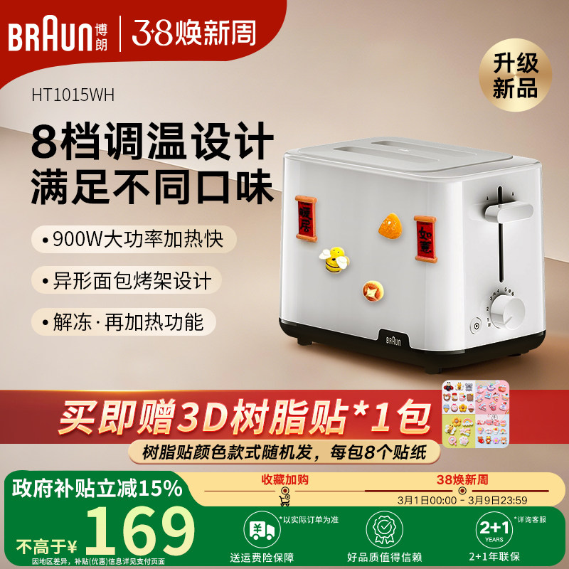 Braun博朗2025年新款多士炉吐司机家用烤面包机早餐机HT1015WH