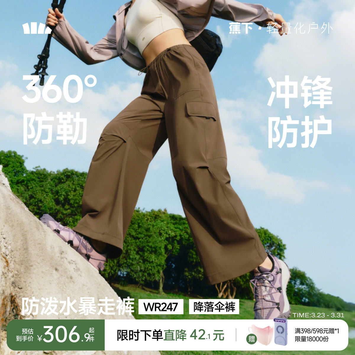 蕉下软壳裤女春季2026新款户外透气登山裤徒步耐磨透气防晒伞兵裤