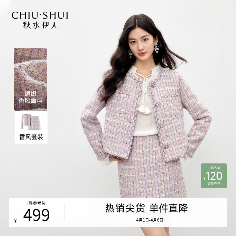 秋水伊人浅紫混色格纹两件套2026年春季新款女圆领珍珠扣口袋套装
