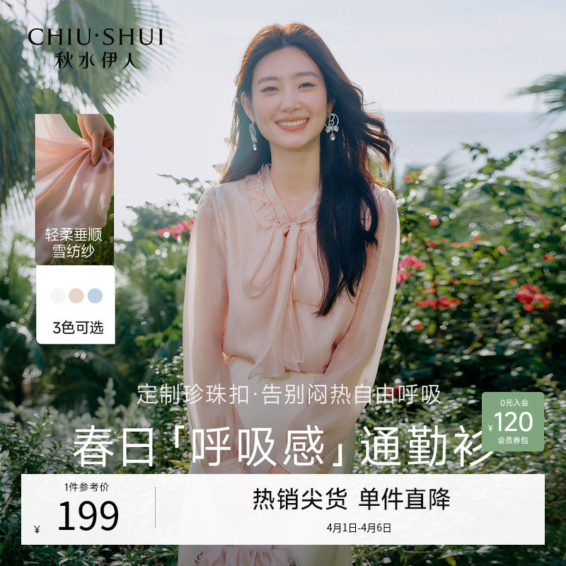 秋水伊人粉色雪纺衫女2026年春季新款领口木耳边优雅飘带衬衫上衣