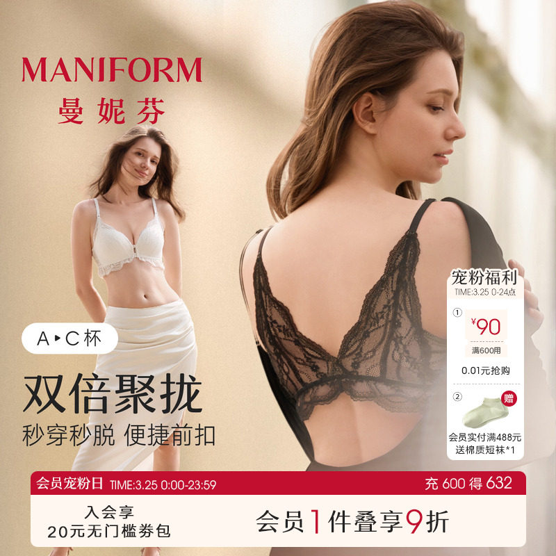 曼妮芬新款双排前扣性感蕾丝美背无钢圈聚拢文胸内衣女舒适软支撑