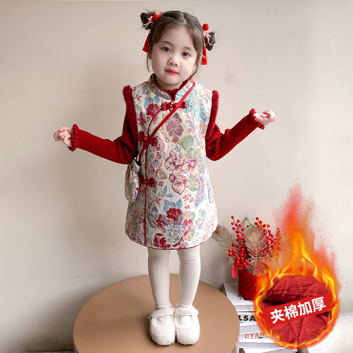 女童旗袍裙女孩中国风夹棉连衣裙冬装2025新款洋气儿童礼服背心裙