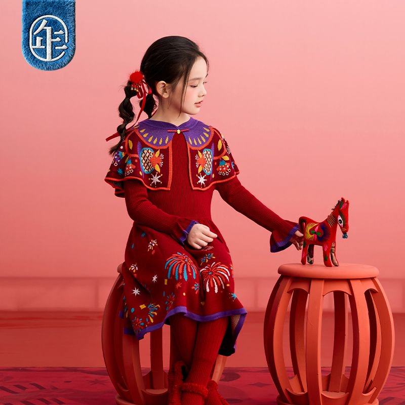 年衣童装女童旗袍裙冬季新款儿童新中式云肩针织连衣裙礼服拜年服
