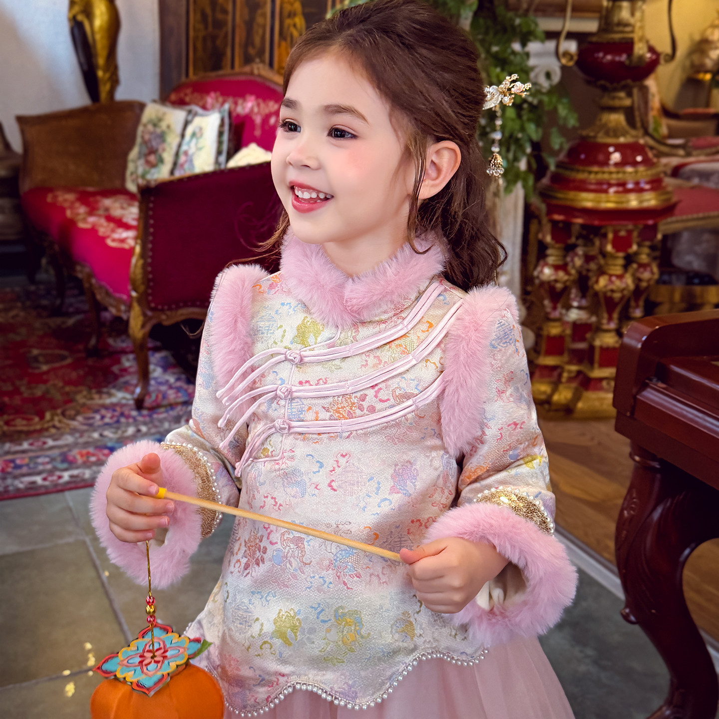 米米哈罗女童旗袍裙冬2025新款儿童唐装拜年服女孩国风加绒连衣裙