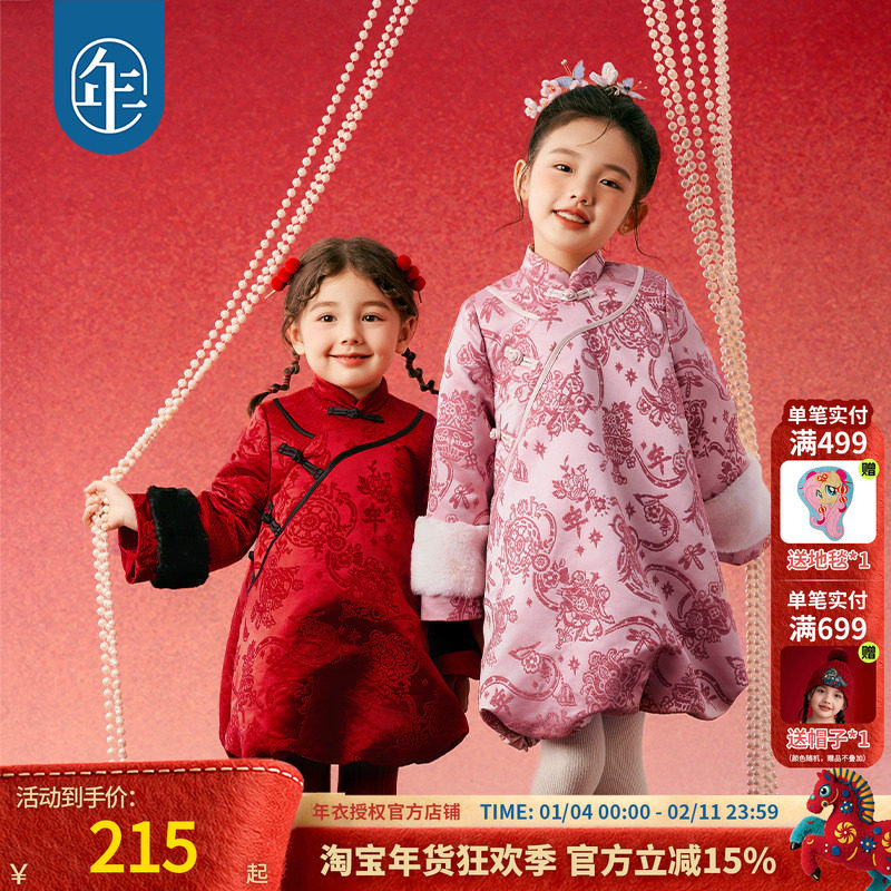米米哈罗女童旗袍裙冬装2025新款儿童中国风夹棉连衣裙女孩新年装