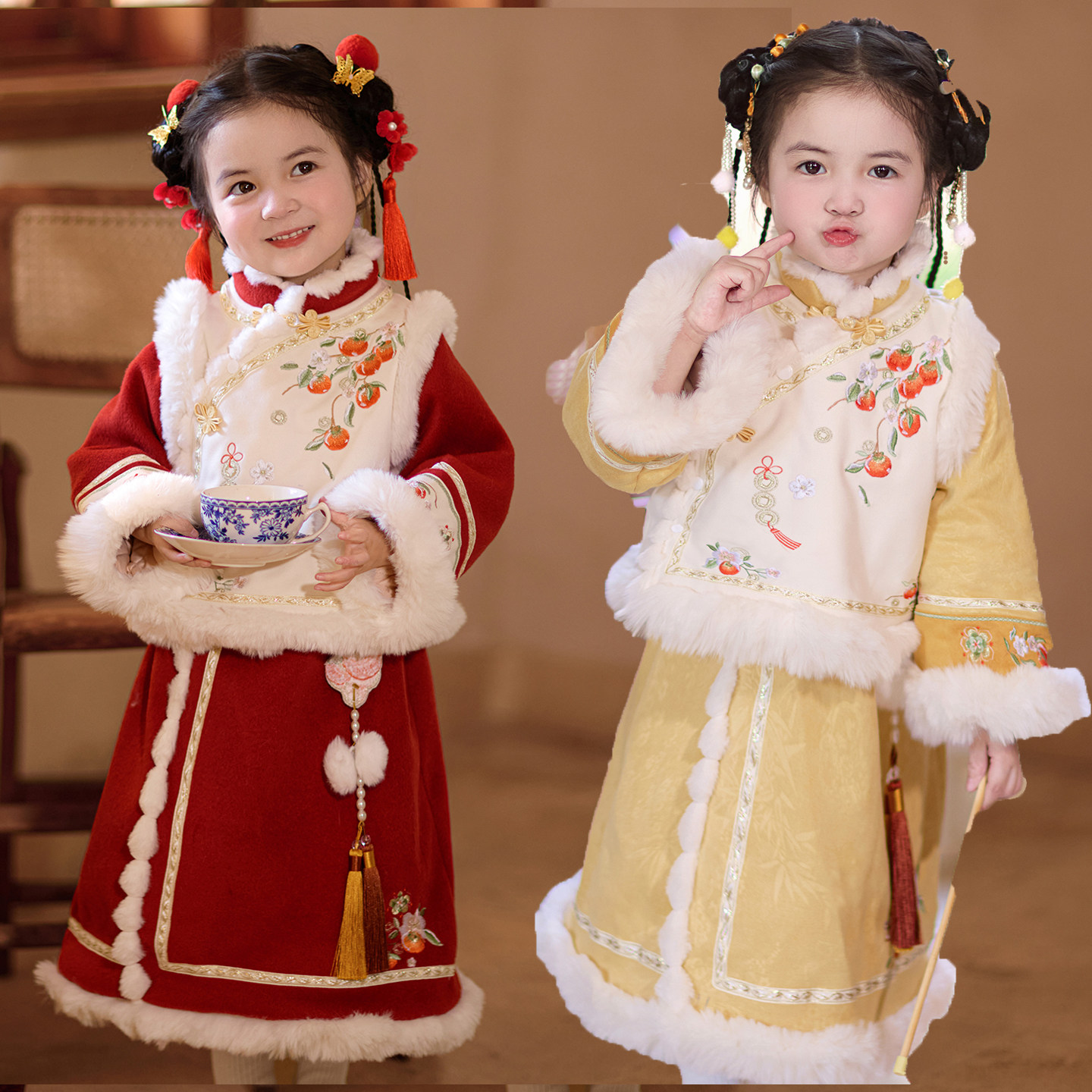 女童旗袍裙套装冬季2025新款儿童国风唐装女孩加绒新年拜年服冬装