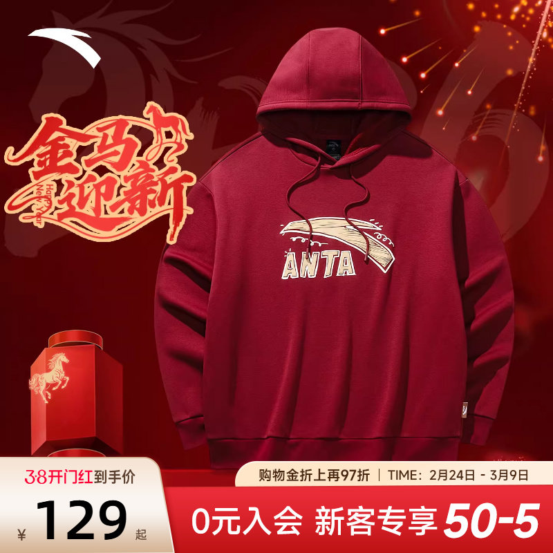安踏新年款红色卫衣情侣装2026新款马年加绒保暖套头连帽运动上衣