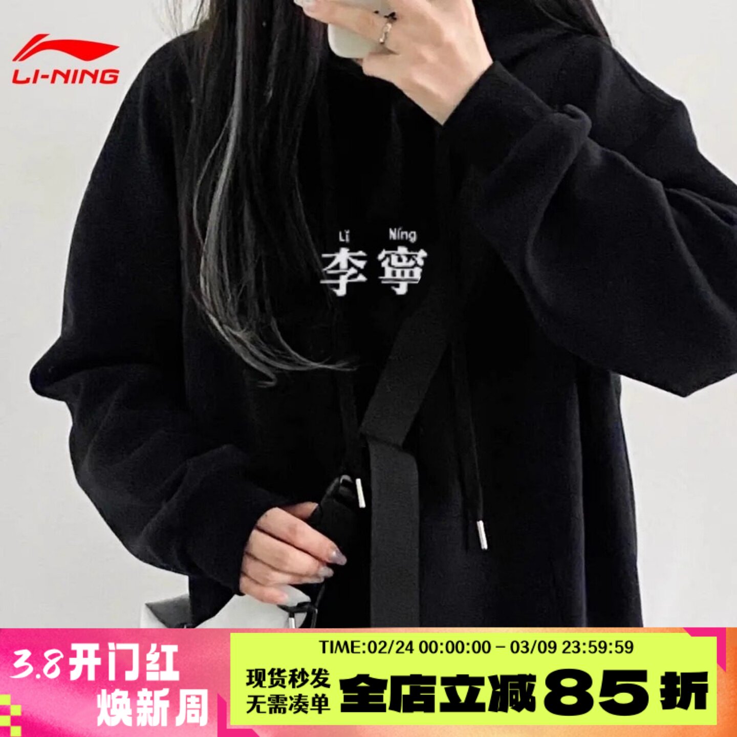 李宁卫衣男士春季官方情侣圆领套头衫黑色上衣宽松长袖运动服女款