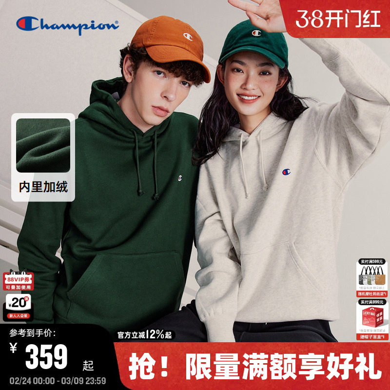 Champion冠军连帽加绒卫衣情侣秋冬潮牌加厚刺绣男纯色女美式潮牌
