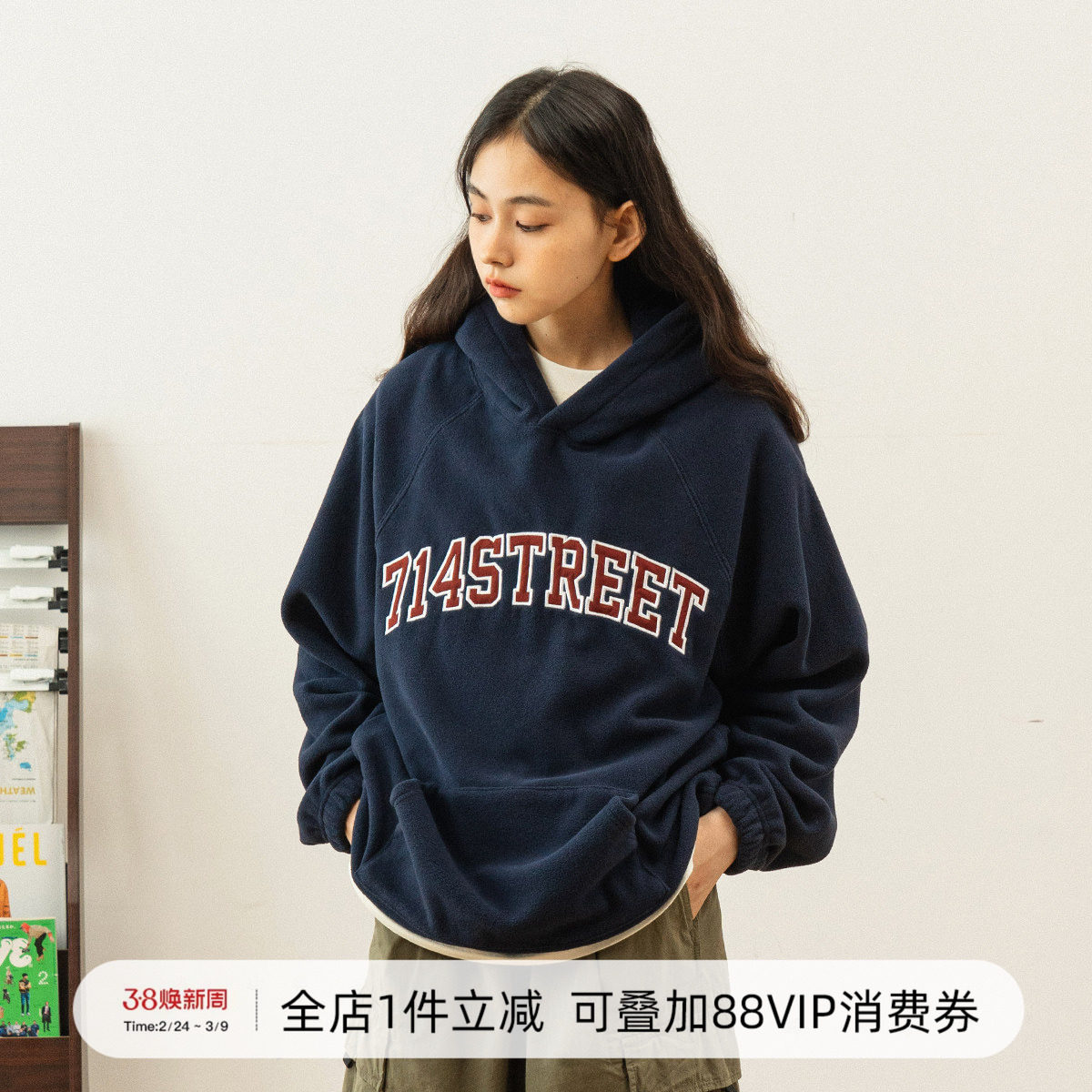 714street22秋新连帽卫衣情侣oversize潮牌复古宽松外套春秋帽衫