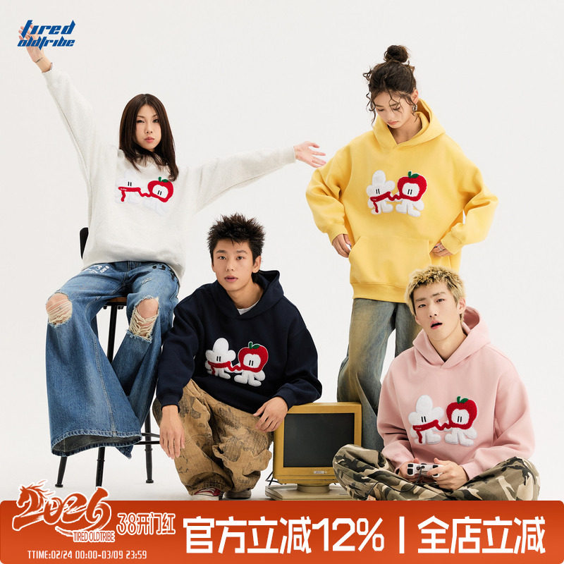 TIRED先生卡通毛巾绣连帽卫衣情侣款宽松套头衫加绒宽松休闲上衣