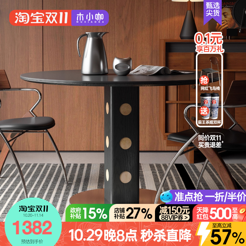 复古实木圆形餐桌现代简约黑色全托意式极简客厅家用伸缩岩板餐桌
