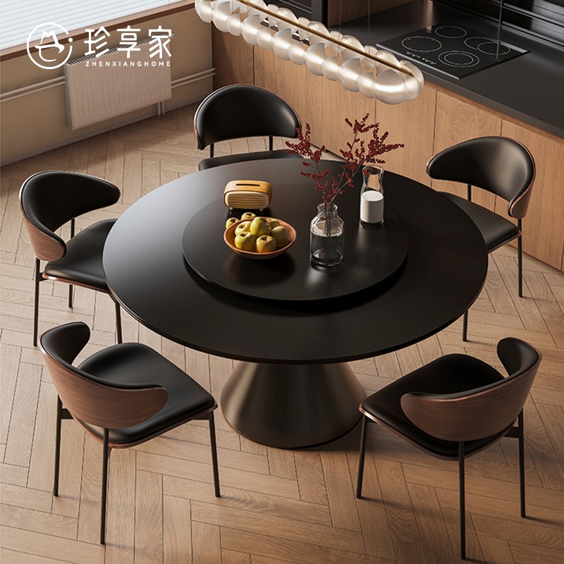 意式极简黑色复古岩板圆形餐桌带转盘家用客厅中古风饭桌2025新款