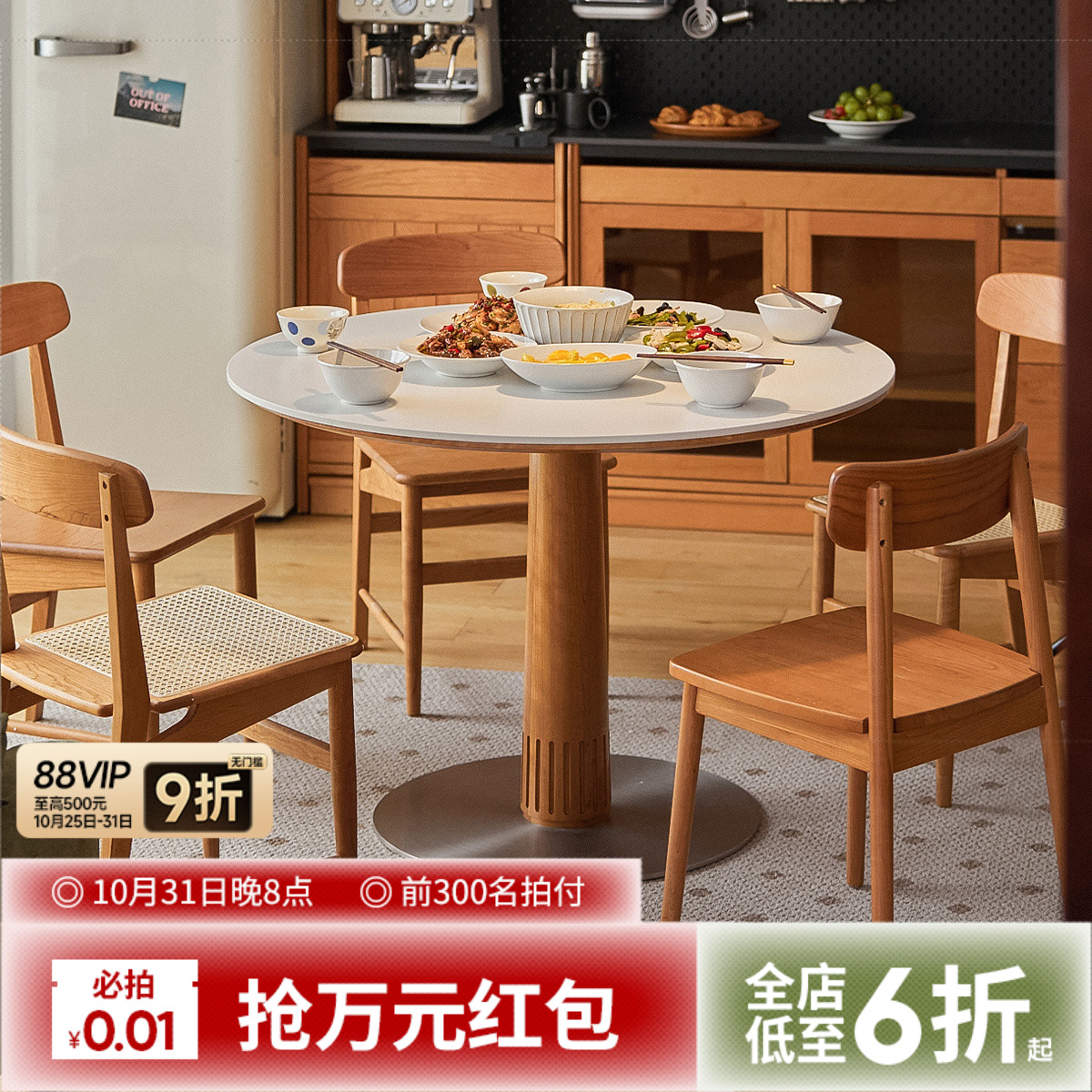 出乎生活秋实岩板圆桌实木圆形餐桌家用樱桃木小户型客厅桌椅组合